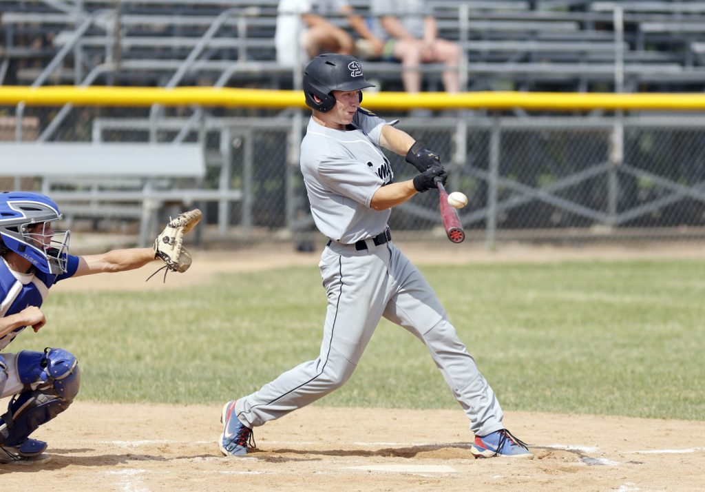 Jaiden Smith, of the Aberdeen Smittys, pops up a pitch as Renner’s Tristin Van Wassenhove, left, catches behind the plate during Friday’s first game at Fossum Field. Photo by John Davis taken 6/24/2022