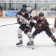 Roope Tuomioksa, of the Aberdeen Wings, center, skates the puck in on St. Cloud goalie Ethan Dahlmeir, far right, as the Norsemen’s Duke Kiffin, left, goes low after the puck during Saturday night’s playoff game at the Odde Ice Center. Photo by John Davis taken 4/22/2023