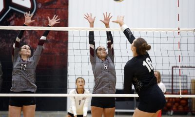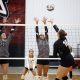 Clark-Willow Lake’s Shay Michalski, right, hits the ball at the net as Aberdeen Roncalli’s Rylee Voeller, left and Karsyn Davis, center, defend, during a match earlier this season at the Roncalli High School gym. Photo by John Davis taken 10/3/2024