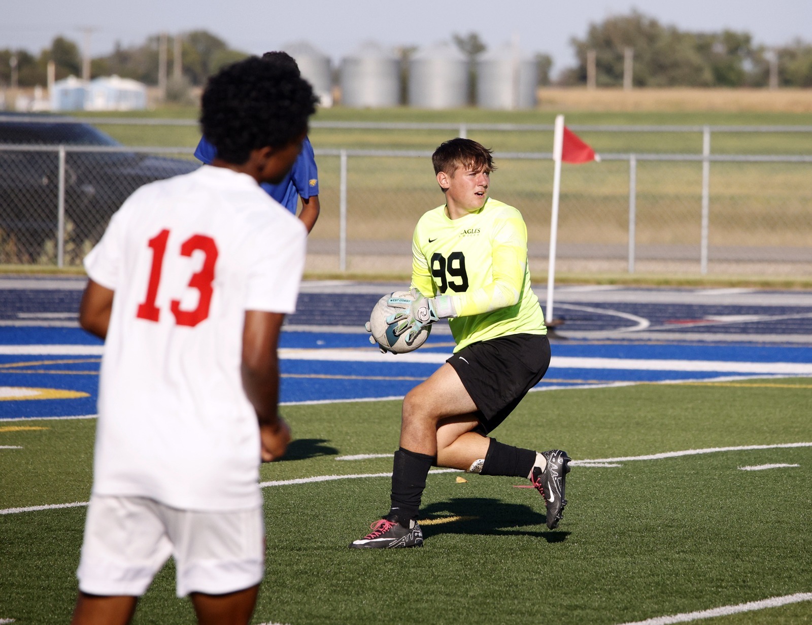 Aberdeen Central’s goal keeper Zander Kuhfeld, center, looks upfield after making a save during a game against Sioux Falls Lincoln last season at Brownell Activities Complex. Kuhfeld recorded a shutout in a win over Harrisburg on Tuesday. Photo by John Davis taken 9/19/2024