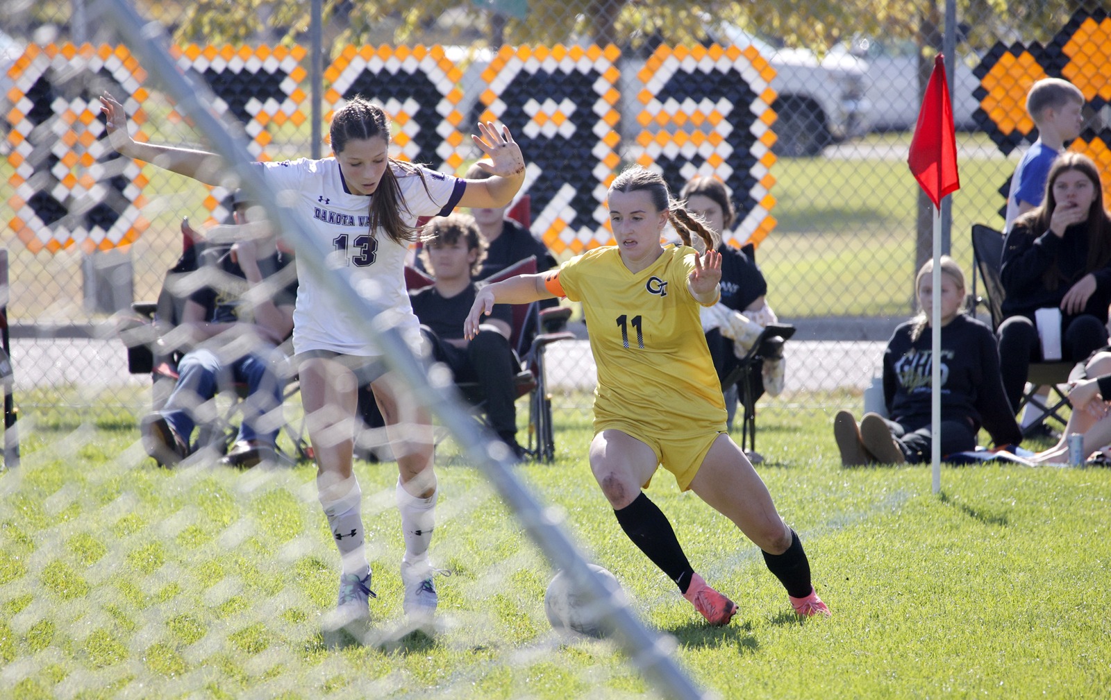 Groton’s Jerica Locke, right, tries to save the ball along the end line near the goal as Dakota Valley’s Julia Bernard, left, defends during a Class A playoff game last season in Groton. Locke had five goals and two assists in a win over Belle Fourche on Friday. Photo by John Davis taken 11/12/2024