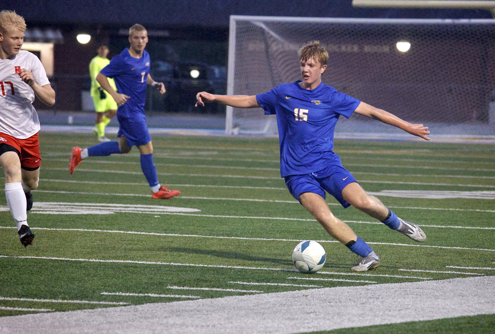 Aberdeen Central’s Tallon Hauge, right, sets to kick the ball as Rapid City Central’s Alex Vermundson, far left, closes in on defense during a match earlier this season at the Brownell Activities Complex. In the background for Aberdeen is Gavin Yost (7). The Golden Eagles are rated third in the Class AA poll. Photo by John Davis taken 8/29/2025