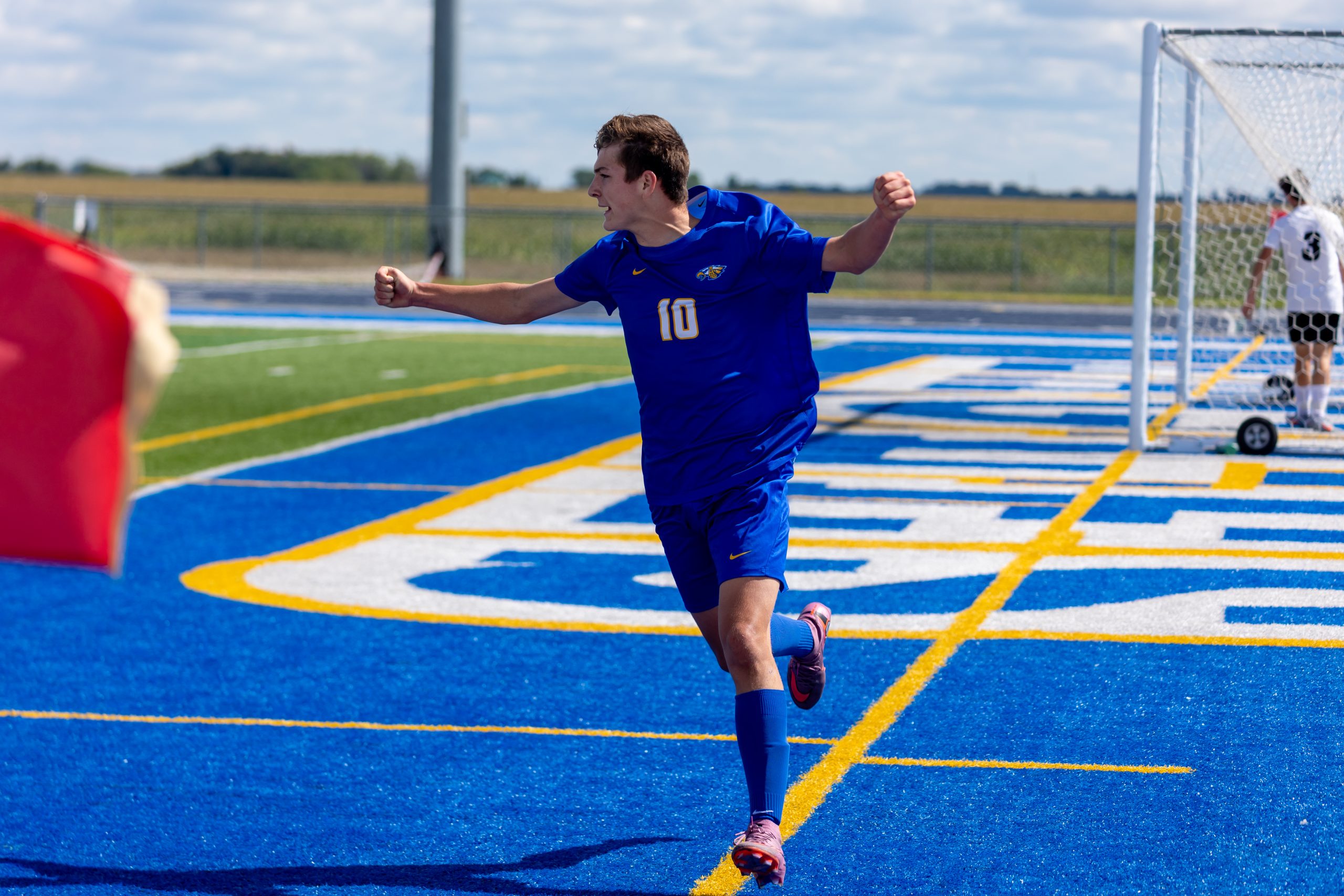 Aberdeen Central's Linus Johnson celebrates after scoring one of his two goals in a boys' soccer win over Brandon Valley Saturday afternoon at Brownell Activities Complex. Photo by Alethiea Wild