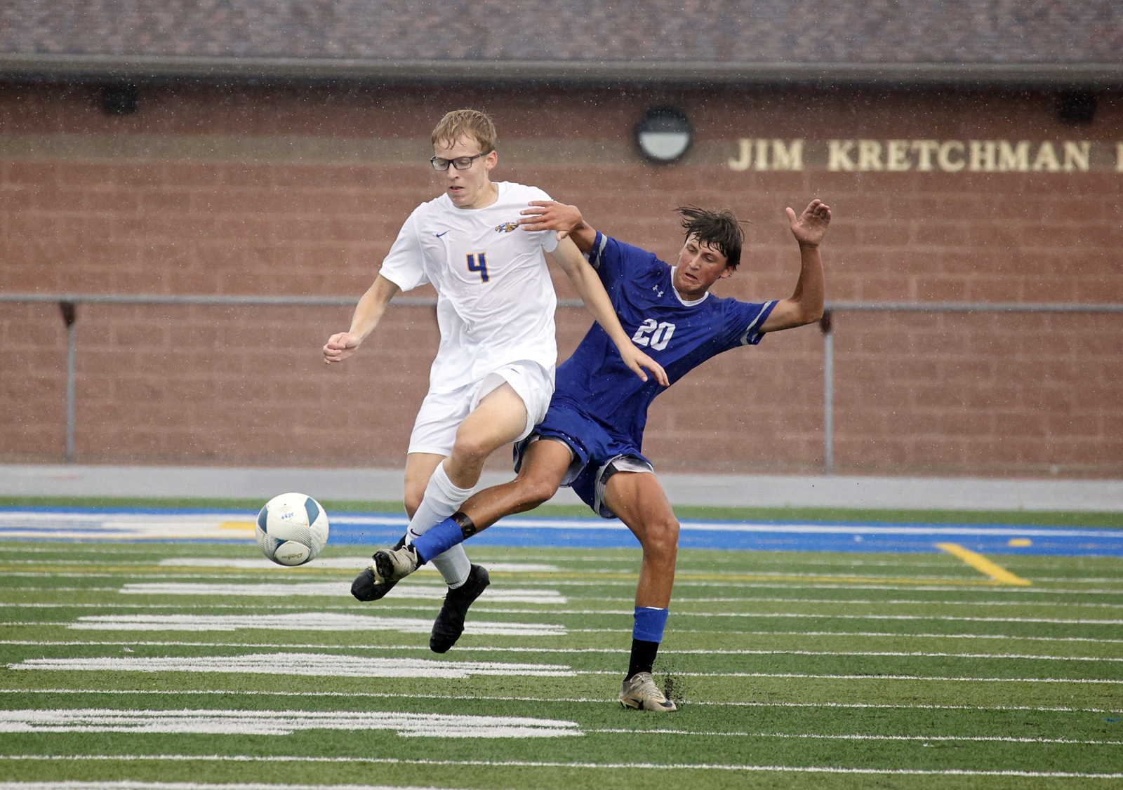 Aberdeen Central’s Isaac Vander Weyst, left, goes after the ball with Rapid City Stevens’ Everett Mockabee, right, during a game earlier this season at the Brownell Activities Complex. The Golden Eagles and Watertown battled to a 1-1 draw on Tuesday. Photo by John Davis taken 8/30/2025