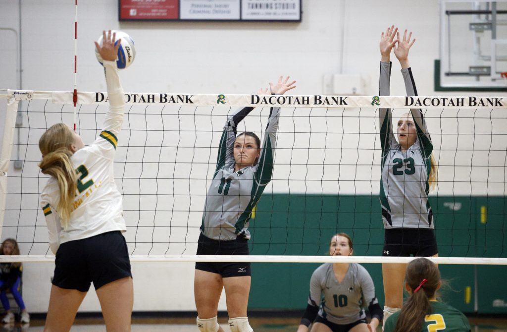 Clark-Willow Lake’s Zoe Nichols, center and Shelby Begeman, right, defend the net as Aberdeen Roncalli’s McKenna O’Keefe, left, hits the ball during a match last season at the Roncalli High School gym. Photo by John Davis taken 10/3/2024