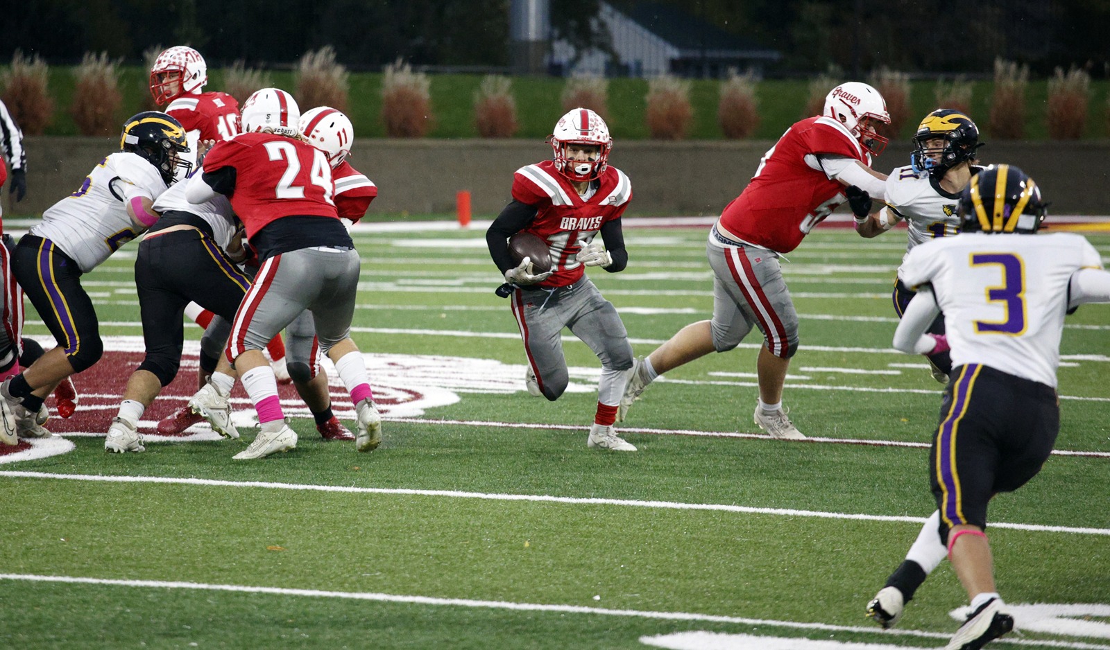 Jace Rein, Jaxon Zuehlke, Bryce Hawkinson, Bennett Suther, Graham Fosness, Mitchell Burger, and Bryce Heitkamp each scored a TD for the Braves, who improved to 4-1 on the season.