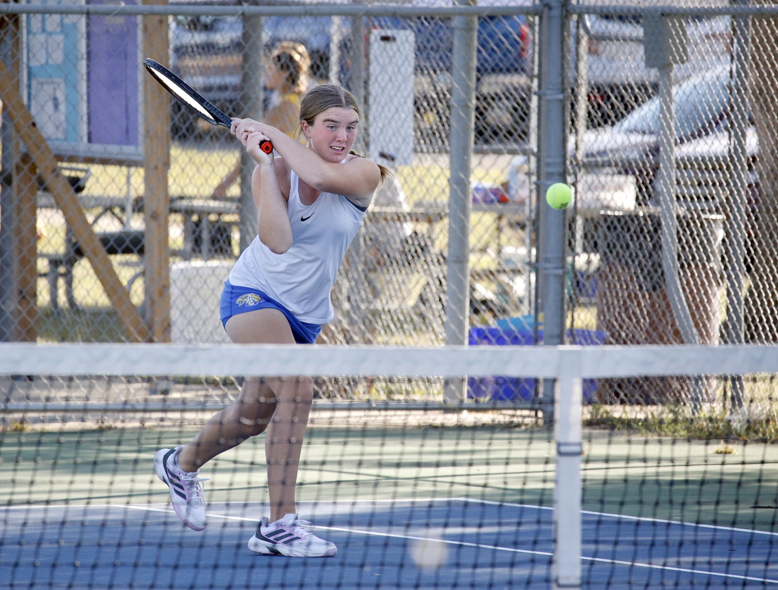 Aberdeen Central’s Mady Holman returns a volley during a dual against Aberdeen Roncalli last season at the Holgate tennis courts. Holman won a singles match and a doubles match Saturday against Sioux Falls Christian. Photo by John Davis