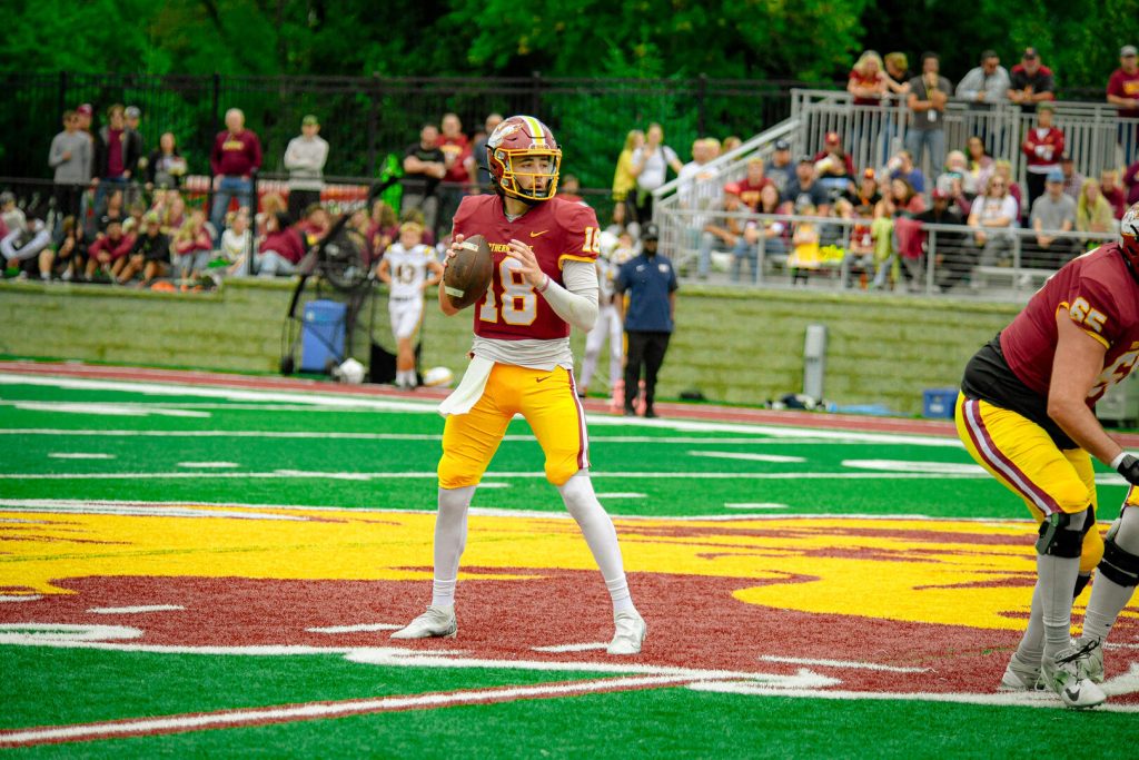 Northern State quarterback Brock Bagozzi surveys the field during Saturday’s win over Concordia-St. Paul at Dacotah Bank Stadium. Bagozzi passed for two touchdowns and ran for another. Photo by Kory Burdick