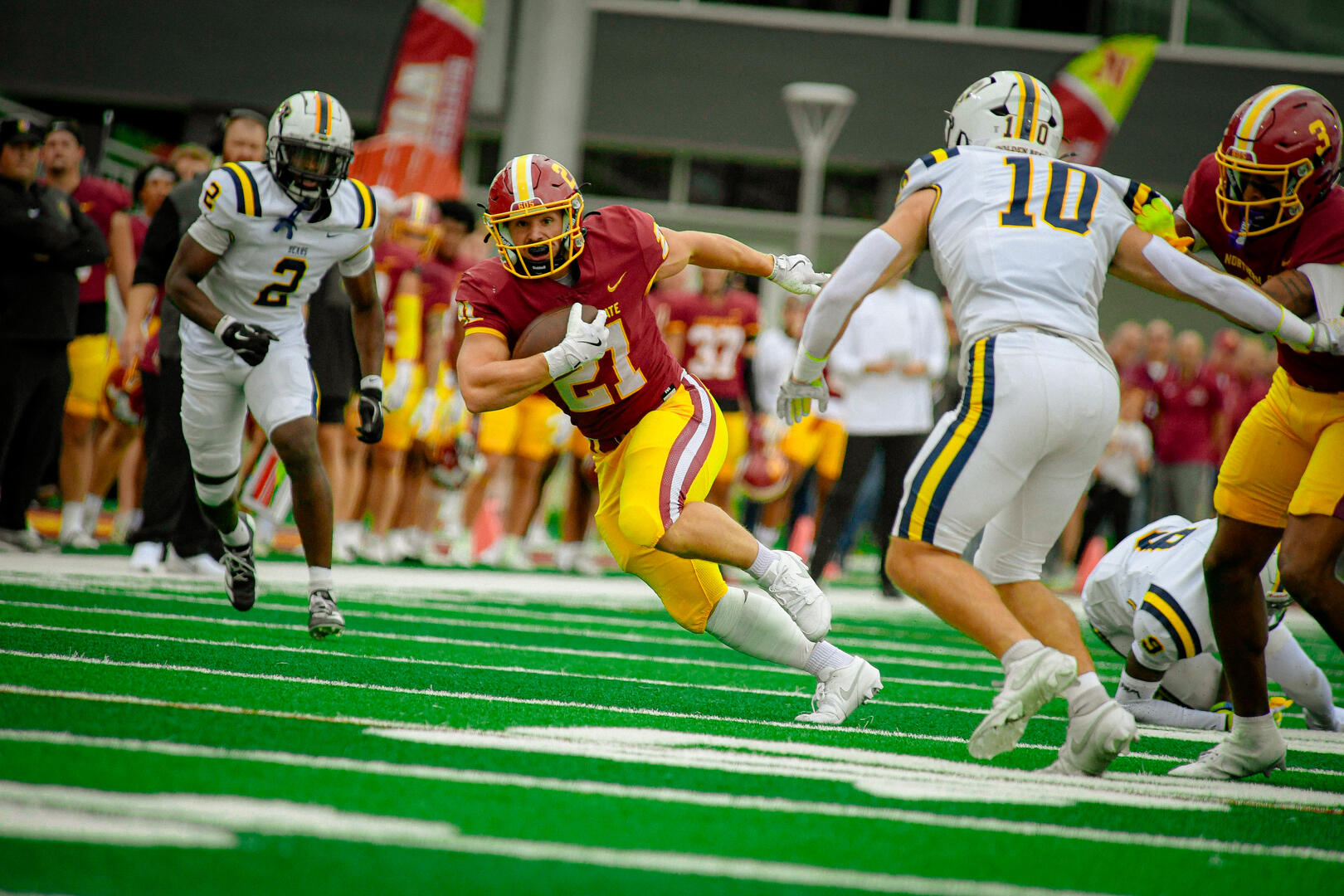 Northern State's Hank Kraft breaks into the open during a game against Concordia-St. Paul at Dacotah Bank Stadium on Saturday afternoon. Kraft scored a pair of touchdowns in a 31-10 Gypsy Days victory. Photo by Kory Burdick