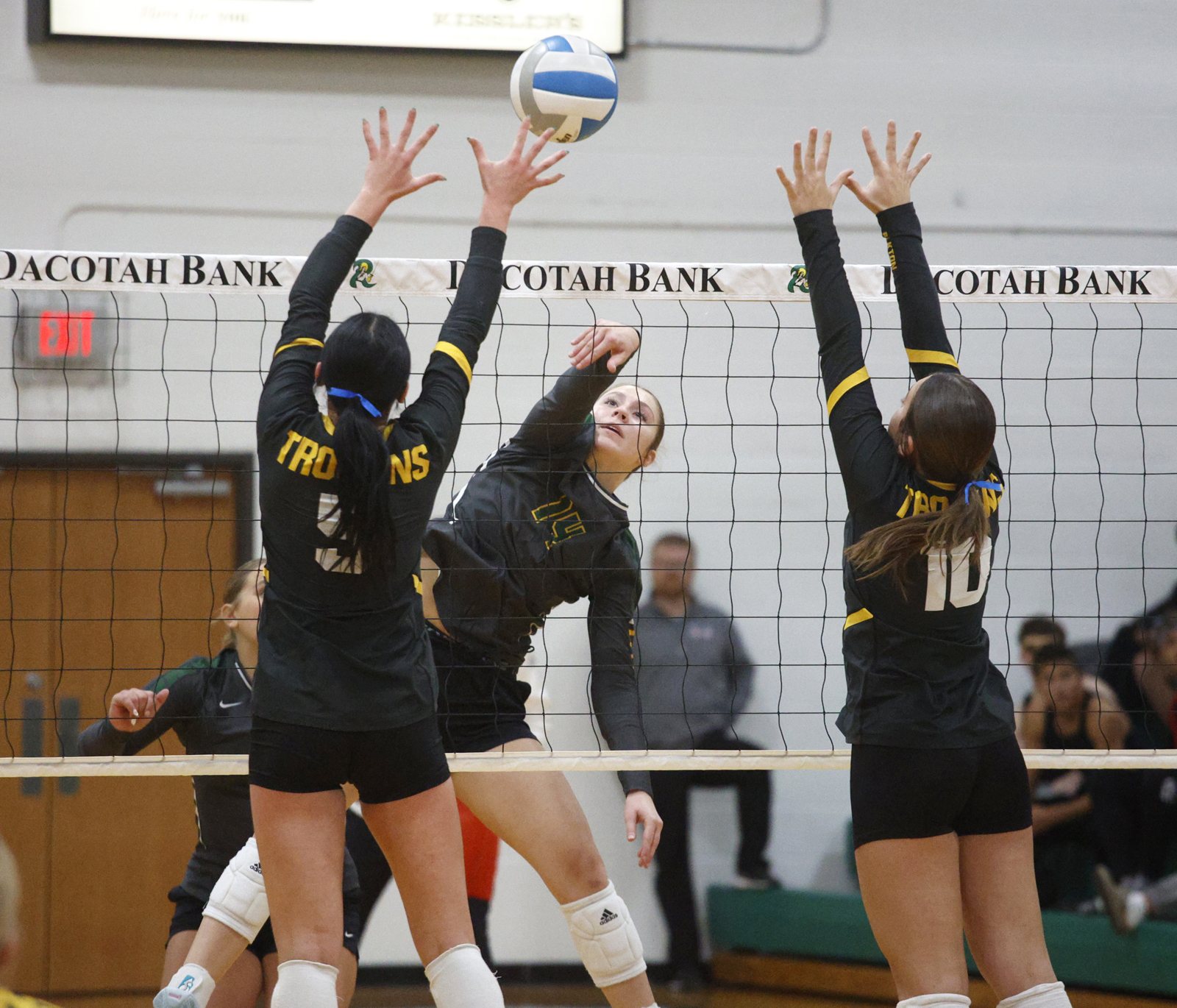 Aberdeen Roncalli’s Grace Cogley, left and Jillian Ellwein, center, defend the net as Faulkton’s Anika Mueller (12) hits the ball during Monday night’s match at the Roncalli High School gym. In the foreground for the Trojans are Claire Cotton, front left and Brooklyn Mueller, front right. Photo by John Davis taken 10/20/2025