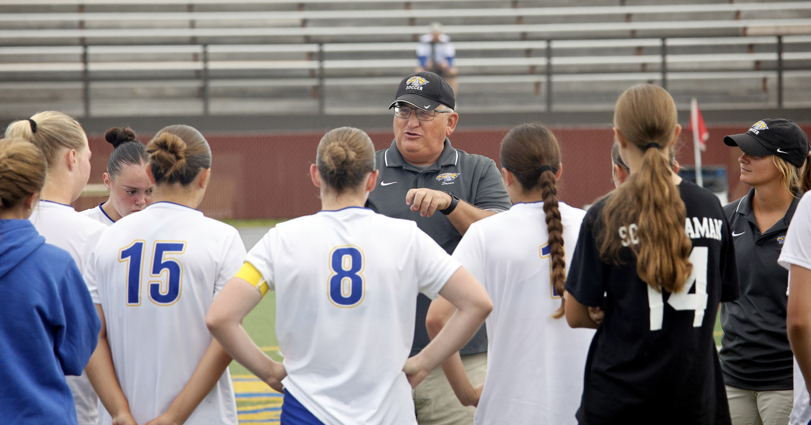 Aberdeen Central girls soccer coach Merle Aske, center, talks to his team after a game against Rapid City Stevens earlier this season at the Brownell Activities Complex. The Golden Eagles host Spearfish at 4 p.m. Tuesday in the opening round of the playoffs. Photo by John Davis taken 8/30/2025