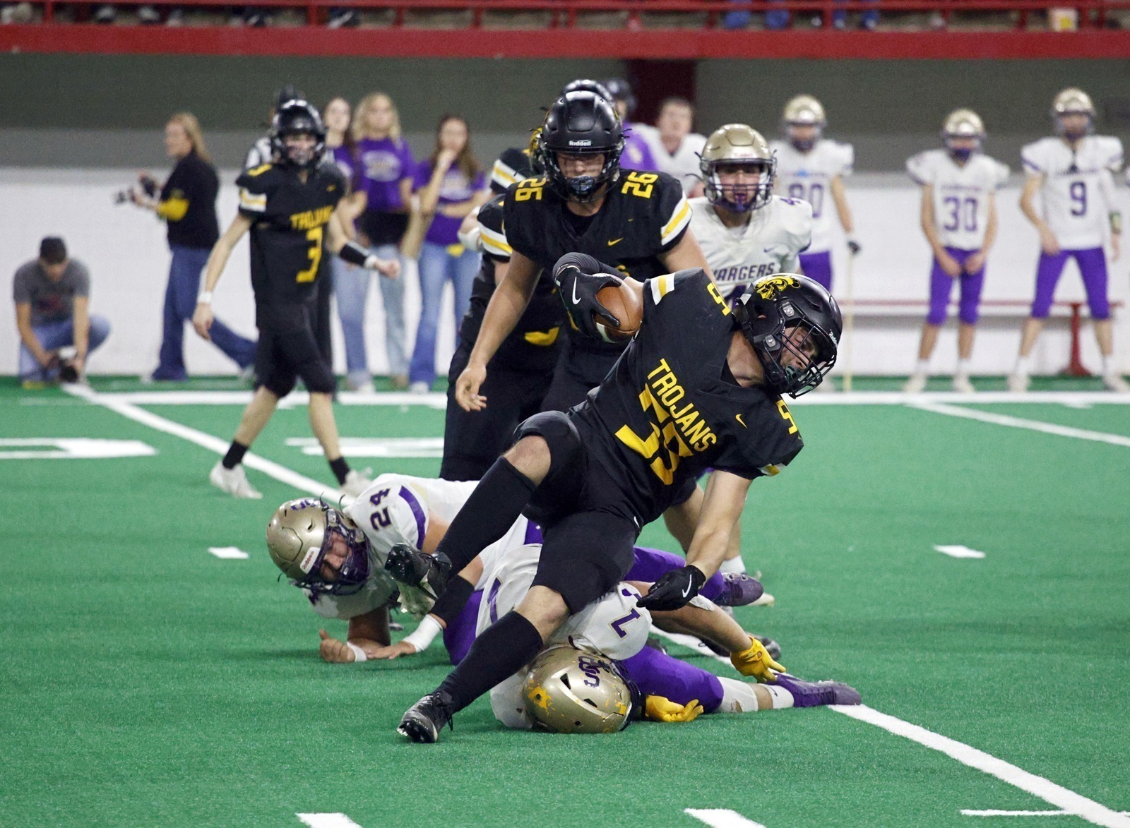 The Trojans rushed for 277 yards in the victory led by Tristen Baloun with 122 yards.