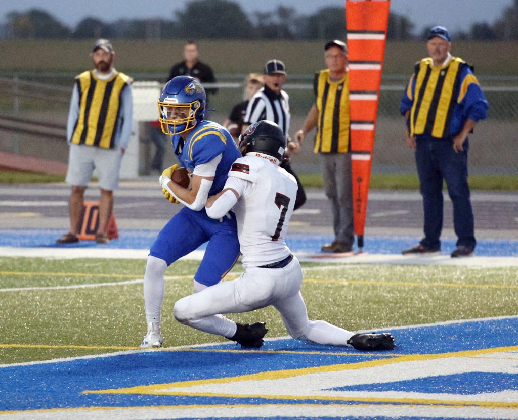 Aberdeen Central’s Karson Borge, left, catches a pass near the goal line for a touchdown as Sturgis’ Seth Burton, right, defends during a game last week at the Brownell Activities Complex. Borge caught a pass for a touchdown and also returned a kickoff for a score in a win over Mitchell Friday night. Photo by John Davis taken 9/26/2025
