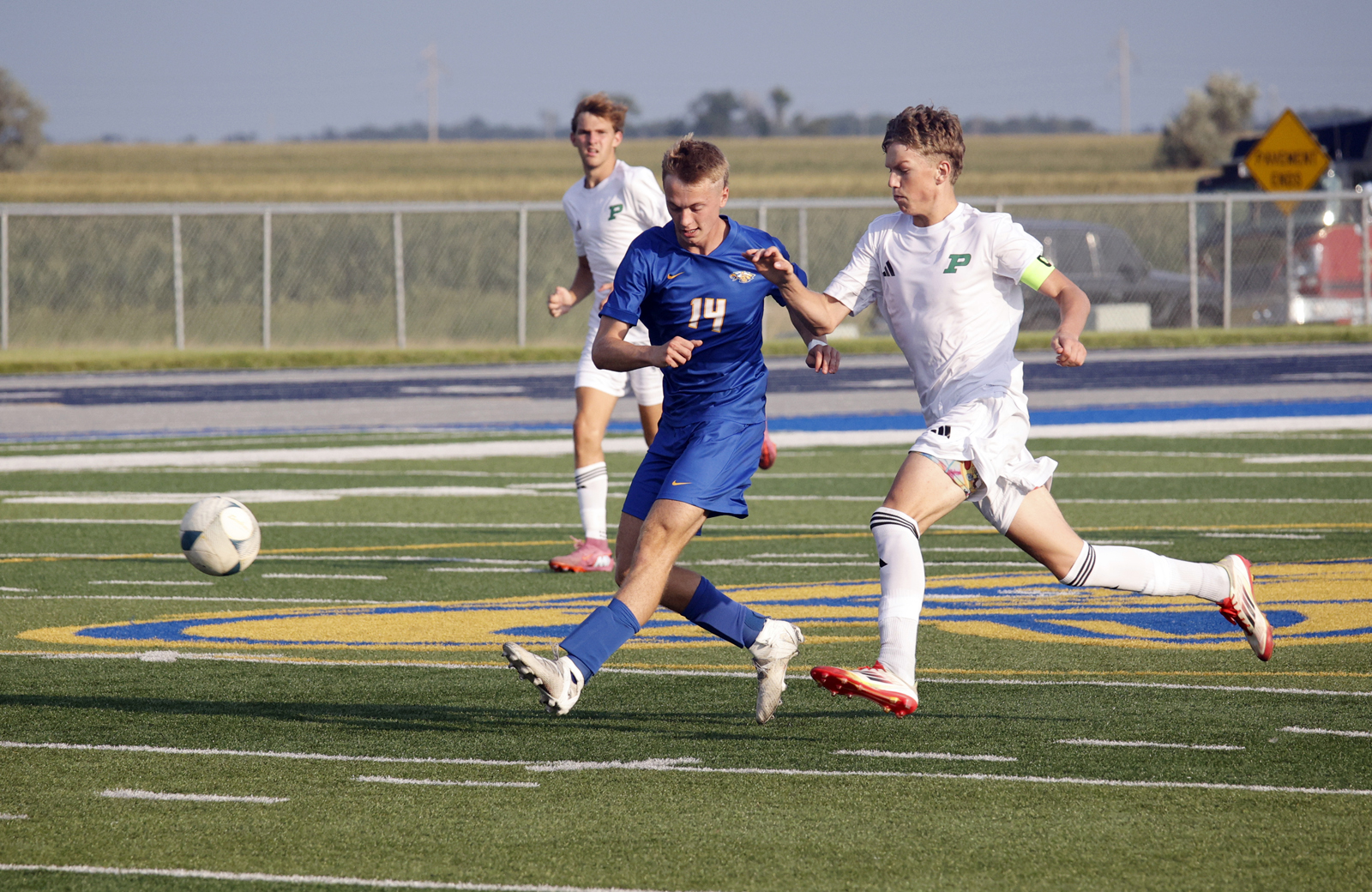Aberdeen Central’s Gus Bjerknes, center, kicks the ball up field away from the defensive persuit of Pierre’s Caiden Ahartz, right, during a game earlier this season at the Brownell Activities Complex. Bjerknes scored a goal in a win over Brookings on Tuesday night. Photo by John Davis taken 8/15/2025
