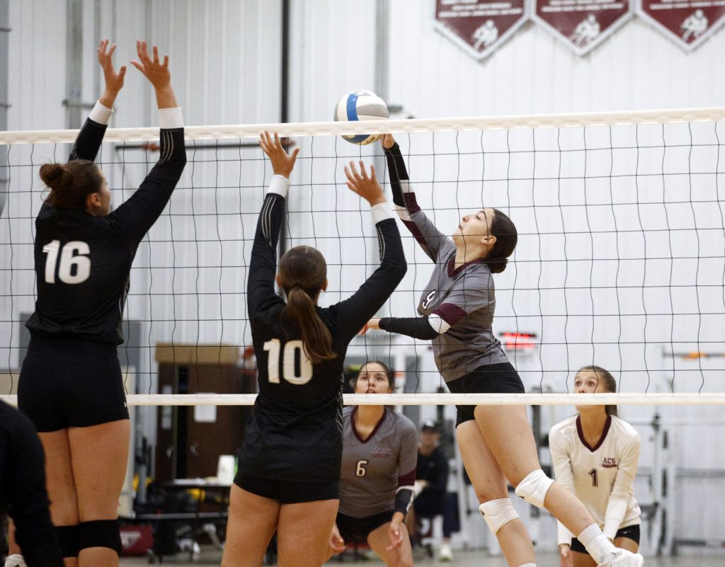 Aberdeen Christian’s Sophie Glynn, right, reaches to hit the ball as Waverly-South Shore’s Carlee Mushitz, left and Clara Heuer, center, defend the net during their match earlier this season at the Aberdeen Christian School gym. In the background for the Knights are Jolie Fogarty (6) and Alexis Isakson (1). Photo by John Davis taken 9/2/2025