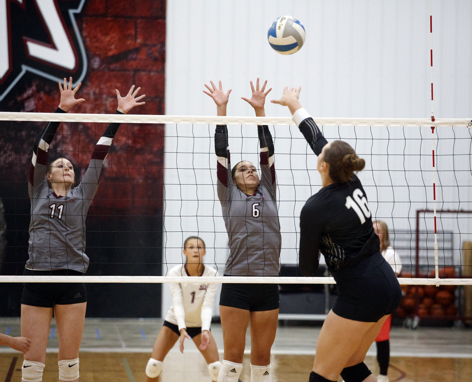 Aberdeen Christian’s Arianna Johnson, left and Jolie Fogarty, center, defend the net as Waverly-South Shore’s Carley Mushitz, right, hits the ball during their match earlier this season at the Aberdeen Christian School gym. Johnson had 20 kills in a victory over Gettysburg on Tuesday night. Photo by John Davis taken 9/2/2025
