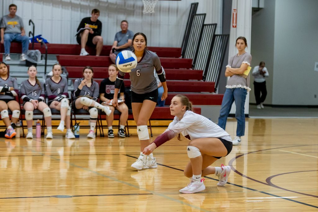 Sawyer Schwan of Aberdeen Christian sets the ball as Reagan Jett prepares to take the set in a match against James Valley Christian Thursday night at the Christian School Gym. Schwan finished with 35 set assists in the match. Photo by Alethiea Wild
