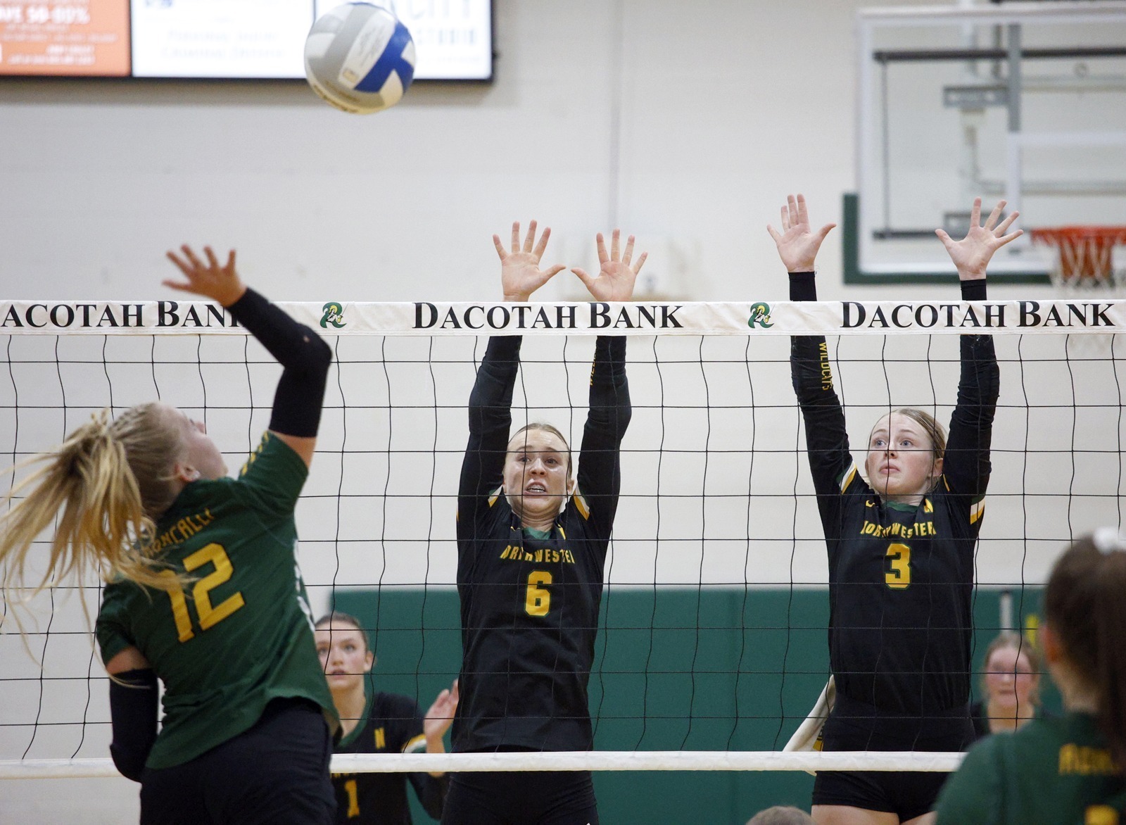 Hitting: Northwestern 28 kills (Ashley Haven 16-17 8 kills, Breelyn Satter 7, Kylee Henjum 5).