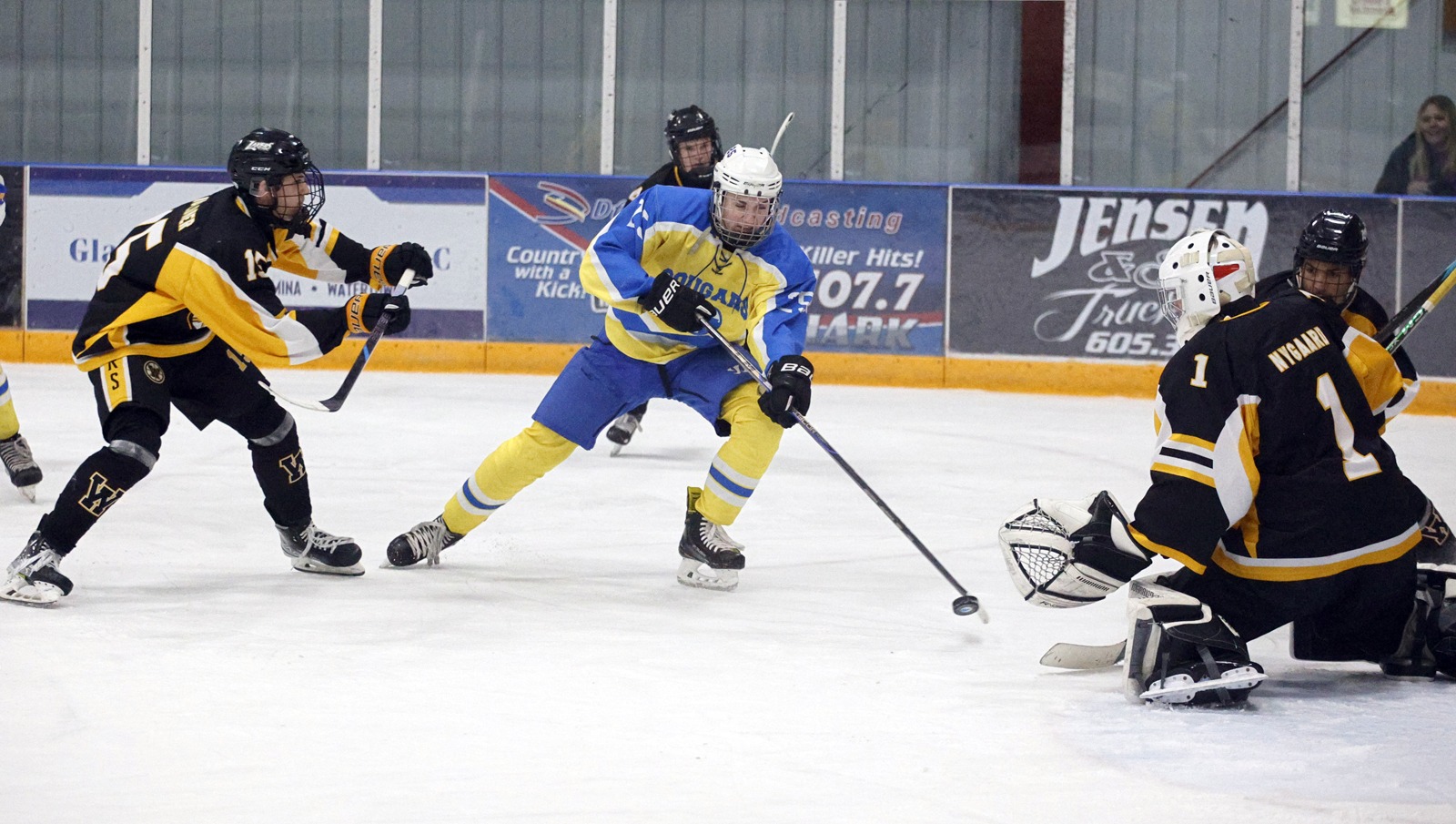 The Cougars edged Brandon Valley 4-3 in overtime on Saturday night before falling to Oahe 6-2 on Sunday at the Odde Ice Center.