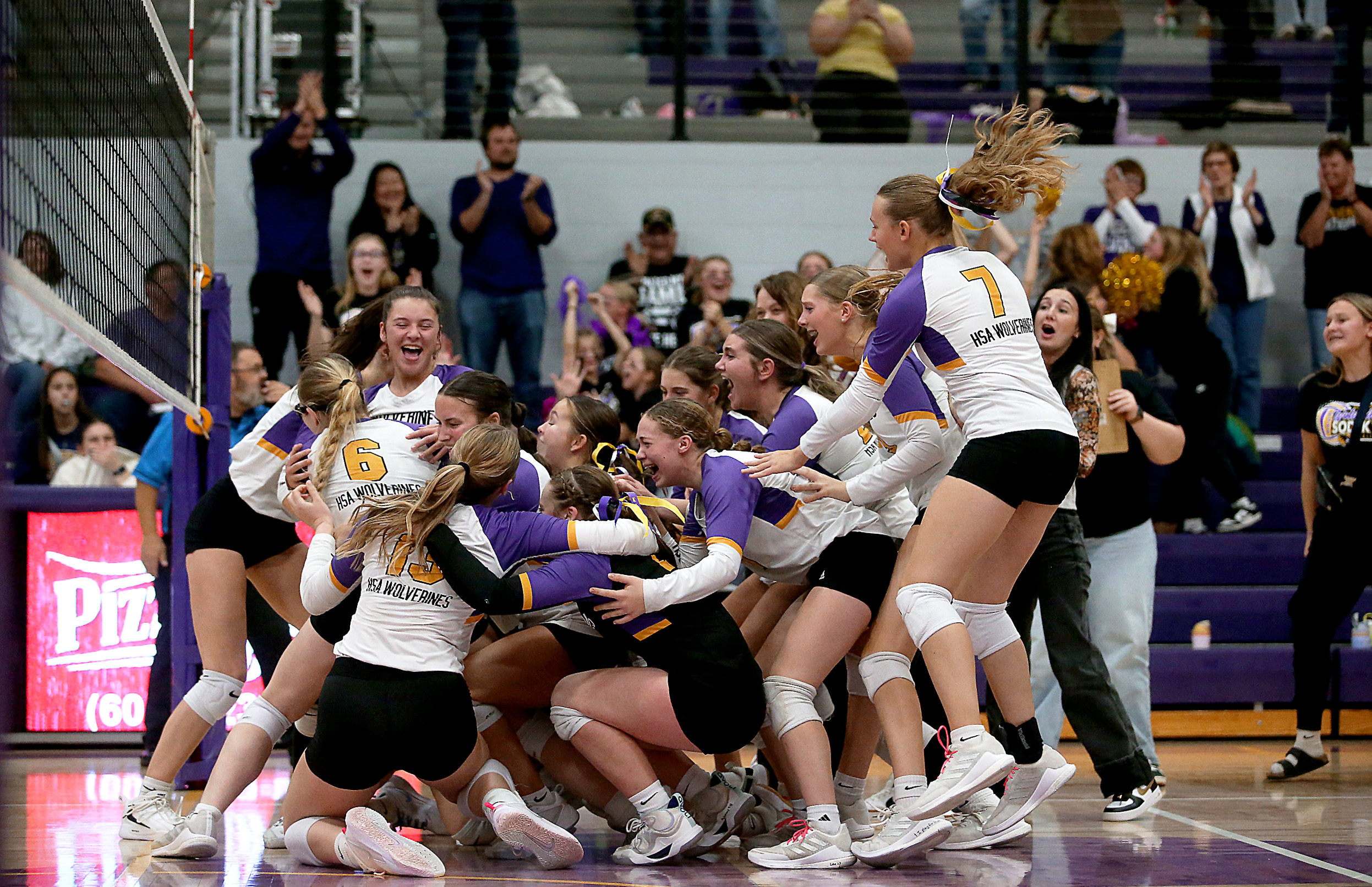 The Herreid-Selby Area Wolverines celebrate their five-set Class B SoDak16 win over Burke to qualify for next week’s state Class B volleyball tournament Tuesday in Fort Pierre. (Rodney Haas/ 605 Sports)