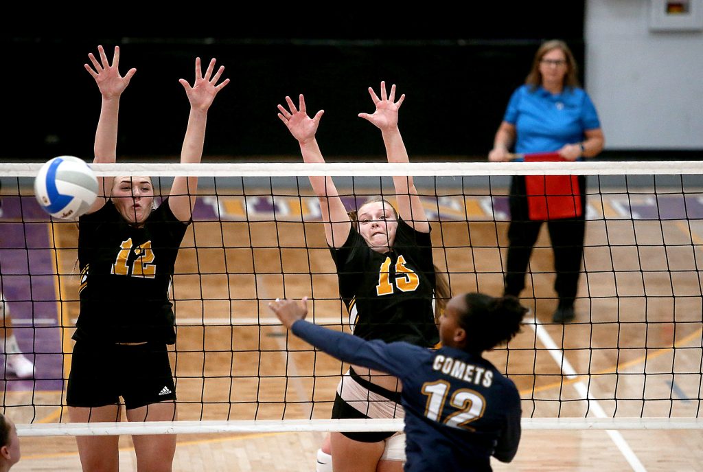 Groton’s Rylee Dunker and Jaedyn Penning go up for a block of Rapid City Christian’s Liza Kieffer during a Class A SoDak 16 volleyball match Tuesday in Fort Pierre. (Rodney Haas/ 605 Sports)