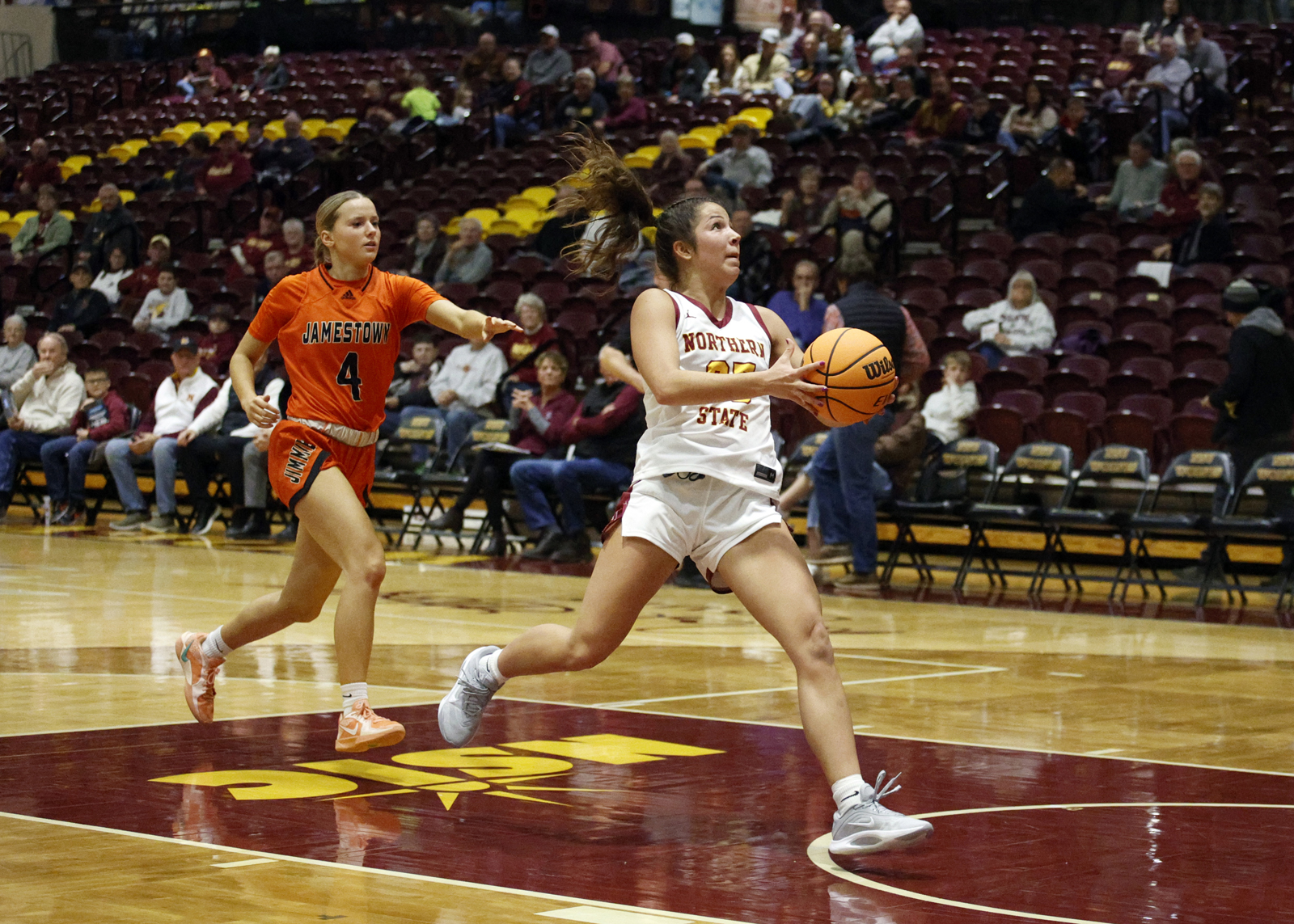 Northern State University’s Izzy Moore, right, drives to the basket ahead of University of Jamestown’s Emily Kurkowski, left, closes in on defense during Wednesday night’s game at Wachs Arena. Photo by John Davis taken 11/26/2025