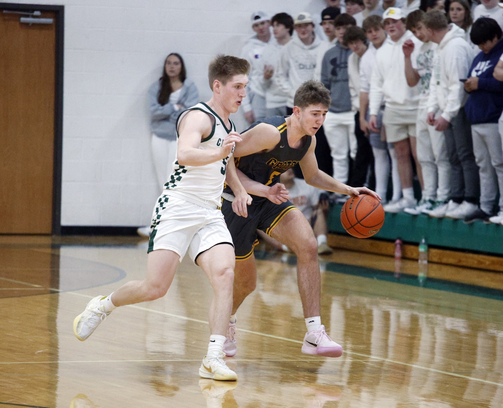 Groton’s Becker Bosma, right, moves the ball up the floor as Aberdeen Roncalli’s Brody Weinmeister, left, closes in on defense during a game last season at the Roncalli High School gym. Bosma scored seven points in a win over Webster on Tuesday. Photo by John Davis taken 2/4/2025