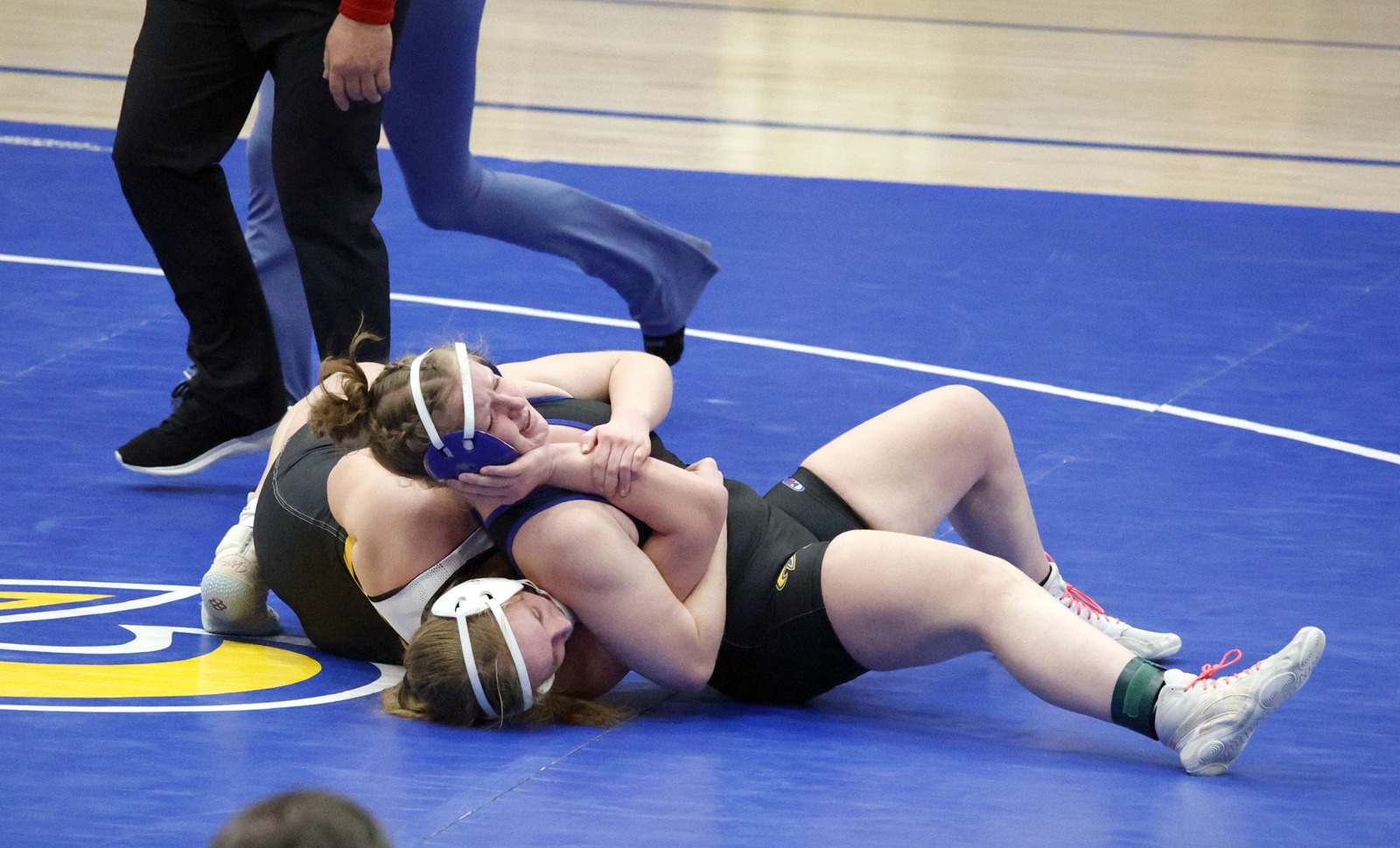 Aberdeen Central’s Lilly Nelson, right, backs on top of Mitchell’s Taylor DeJong in the closing seconds of their semifinal match at the Region 3 Girls Wrestling Tournament last season at the Golden Eagles Arena. Nelson had a pin during a dual against Spearfish Thursday night. Photo by John Davis taken. 2/20/2025