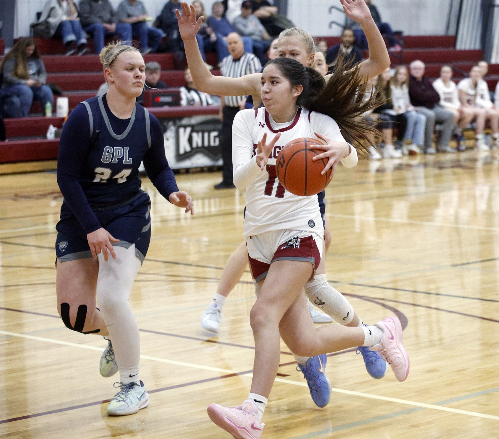 Aberdeen Christian’s Jolie Fogarty, right, drives to the basket as Great Plains Lutheran’s Madeline Prahl, left and Katherine Prahl (behind Fogarty) during a game last season at the Aberdeen Christian School gym. Photo by John Davis taken 1/25/2025