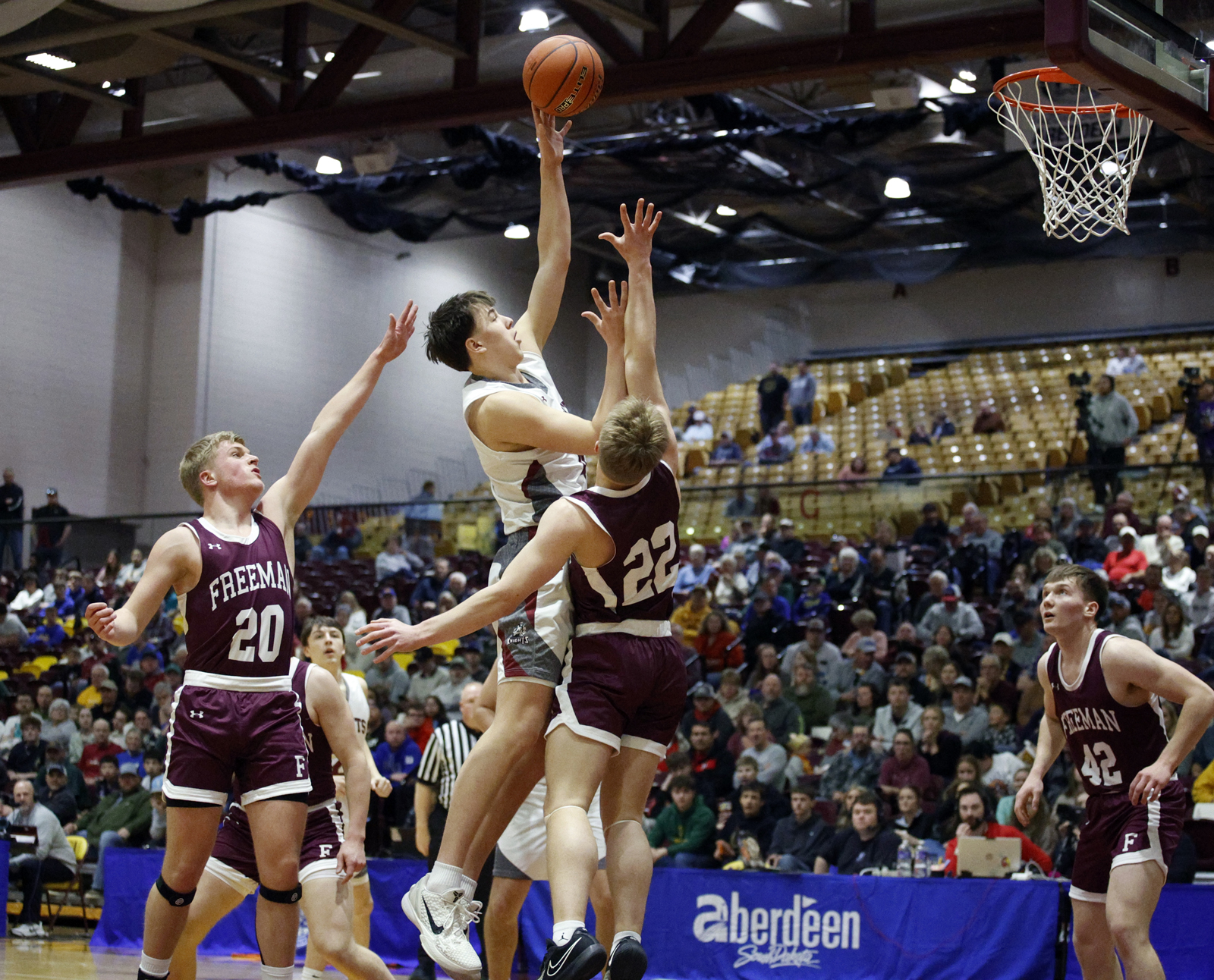 Aberdeen Christian’s Brooks Jett, center, goes up with a shot between Freeman’s Luke Miller, left and Luke Peters, right, as Tate Sorensen looks on at far right, during last year's South Dakota Class B Boys Basketball Tournament at Wachs Arena. Photo by John Davis taken 3/21/2025