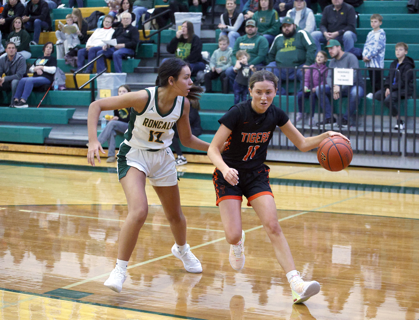 Mobridge-Pollock’s Faith Heil, right, drives around Aberdeen Roncalli’s Karsyn Davis, left, during Tuesday night’s game at the Roncalli High School gym. Photo by John Davis taken 12/16/2025