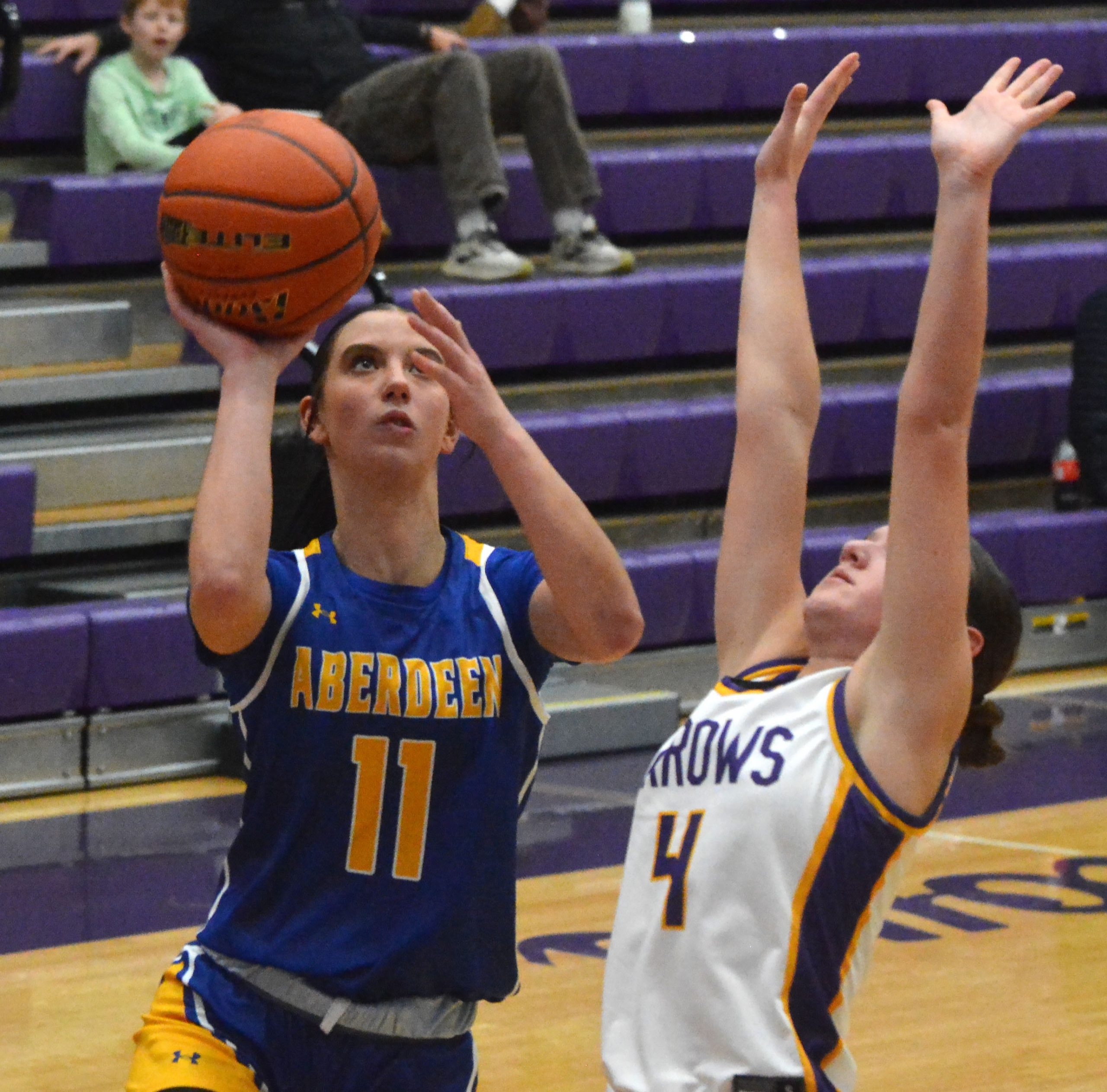 Aberdeen Central's Kamdyn Borge puts up a shot against Watertown's Andi Olson during their high school girls basketball game on Tuesday at the Watertown Civic Arena. Courtesy photo