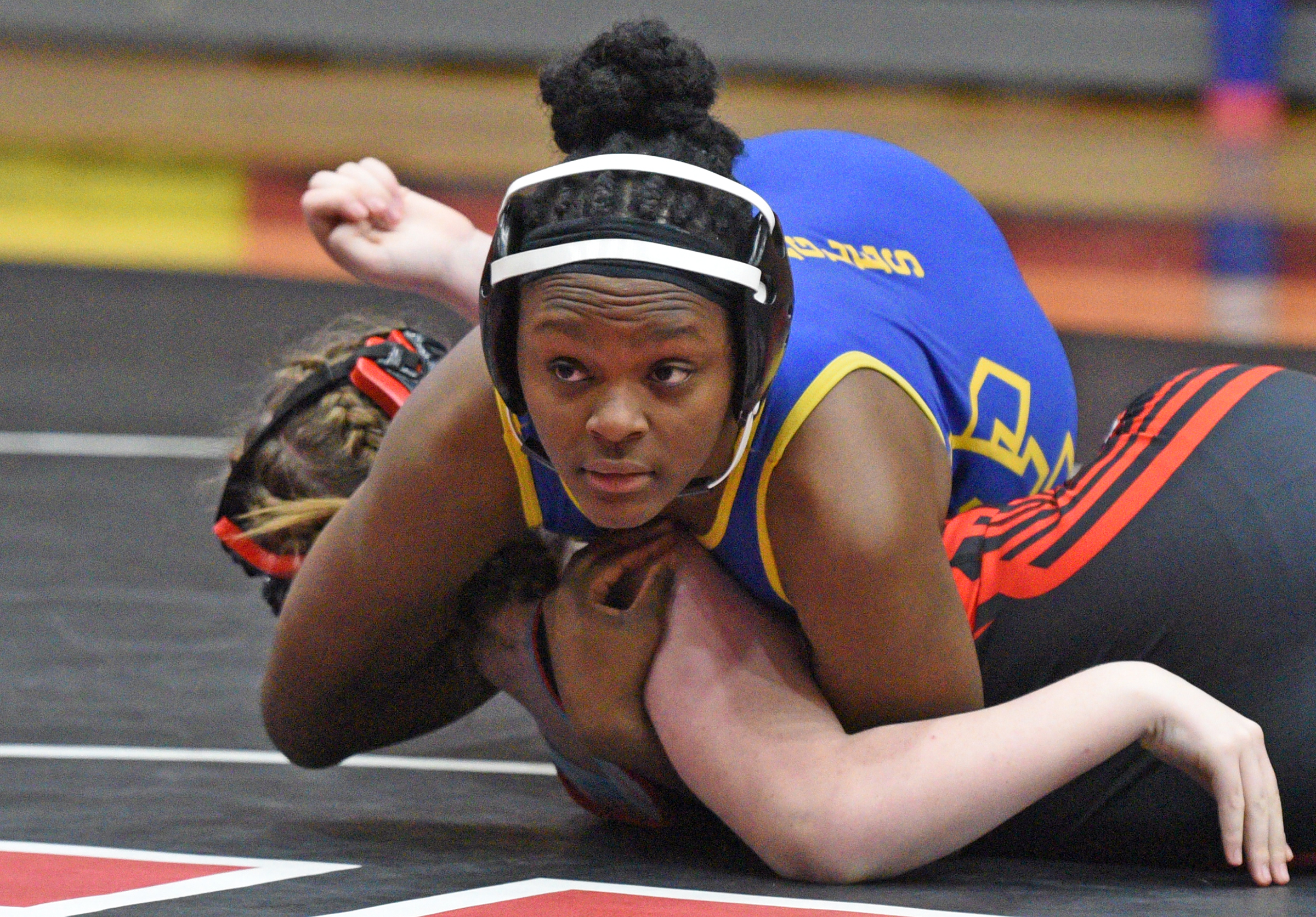 Aberdeen Central's Rakyrah Wallace goes for the pin against Yankton's Peyton Kyte during their 140-pound match, part of a wrestling dual on Thursday in Yankton. Photo by James Cimburek/Yankton Press & Dakotan