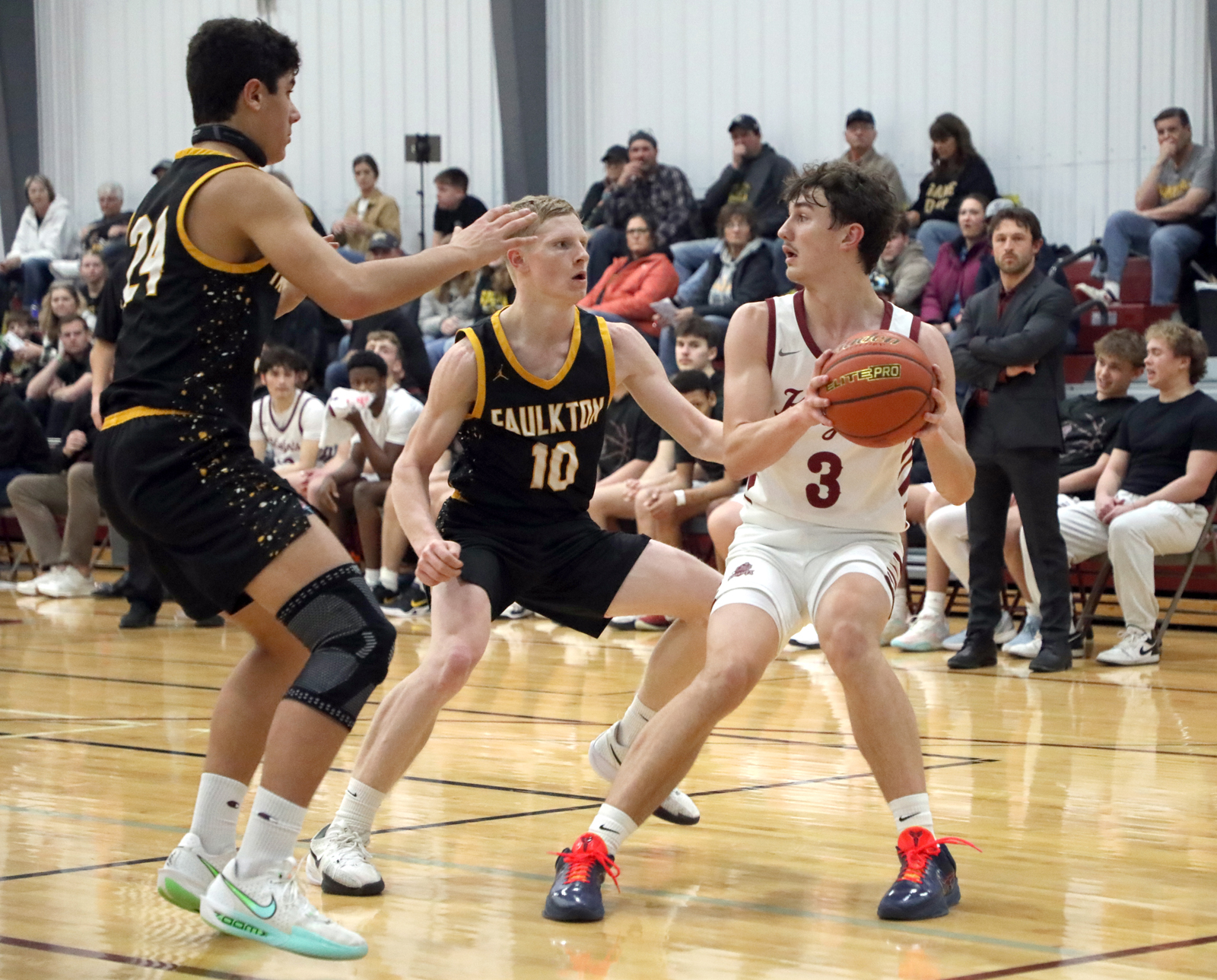 Aberdeen Christian’s Luke Kaiser, right, looks for a teammate as Faulkton’s Spencer Melius, center and Landon Dikoff, left, close in on defense during Tuesday night’s game at the Aberdeen Christian School gym. Photo by John Davis taken 1/21/2026