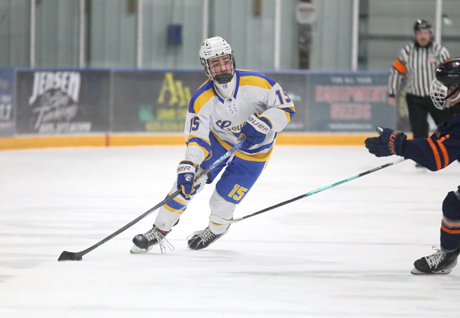Wheeler Malsam, of the Aberdeen Cougars, center, moves the puck up ice as Spencer Charron, of the Sioux Falls Flyers West, right, skates back on defense during Saturday night’s game at the Odde Ice Center. Photo by John Davis taken 1/24/2026