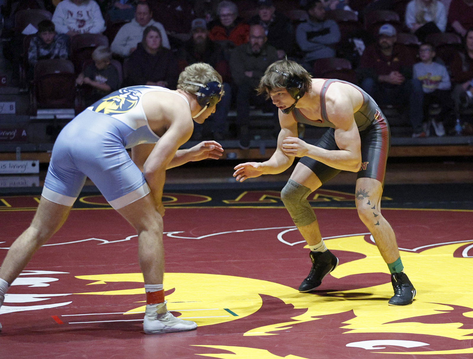 Northern State University’s Brady Westall, right, looks for an opening against Augustana University’s Josh Wagener, left, during a dual earlier this season at Wachs Arena. Westall pulled out an 8-7 win in a dual against Parkside Saturday evening. Photo by John Davis taken 12/4/2025