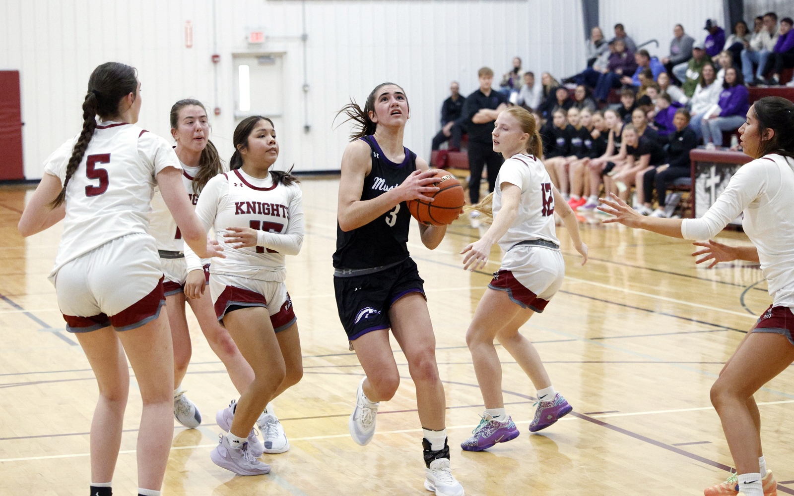 Waubay-Summit’s Addison Heinje, center, moves to the basket as Aberdeen Christian’s Arianna Johnson (5), Sophia Eichler, back left, Jacie Fogarty, left, Molleigh Hofer, right and Jolie Fogarty, far right, look on during a game earlier this season at the Aberdeen Christian School gym. Heinje scored 18 points in a win over Elkton-Lake Benton on Saturday. Photo by John Davis taken 1/10/2026