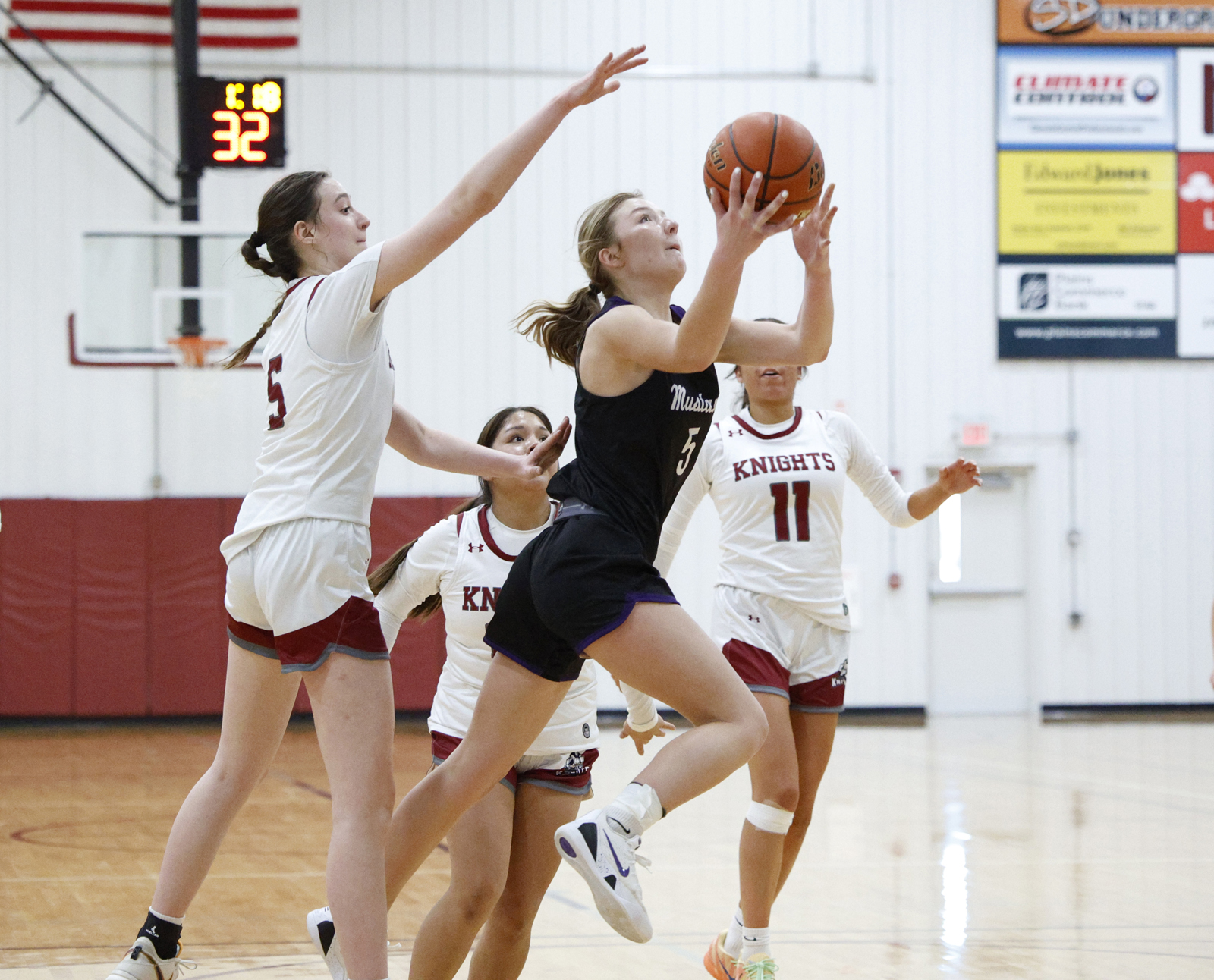 Waubay-Summit’s Liza Purdy, center, moves to the basket past Aberdeen Christian’s Arianna Johnson, left, during a game earlier this season at the Aberdeen Christian School gym. Behind the play are the Knights’ Jacie Fogarty and Jolie Fogarty. Photo by John Davis taken 1/10/2026