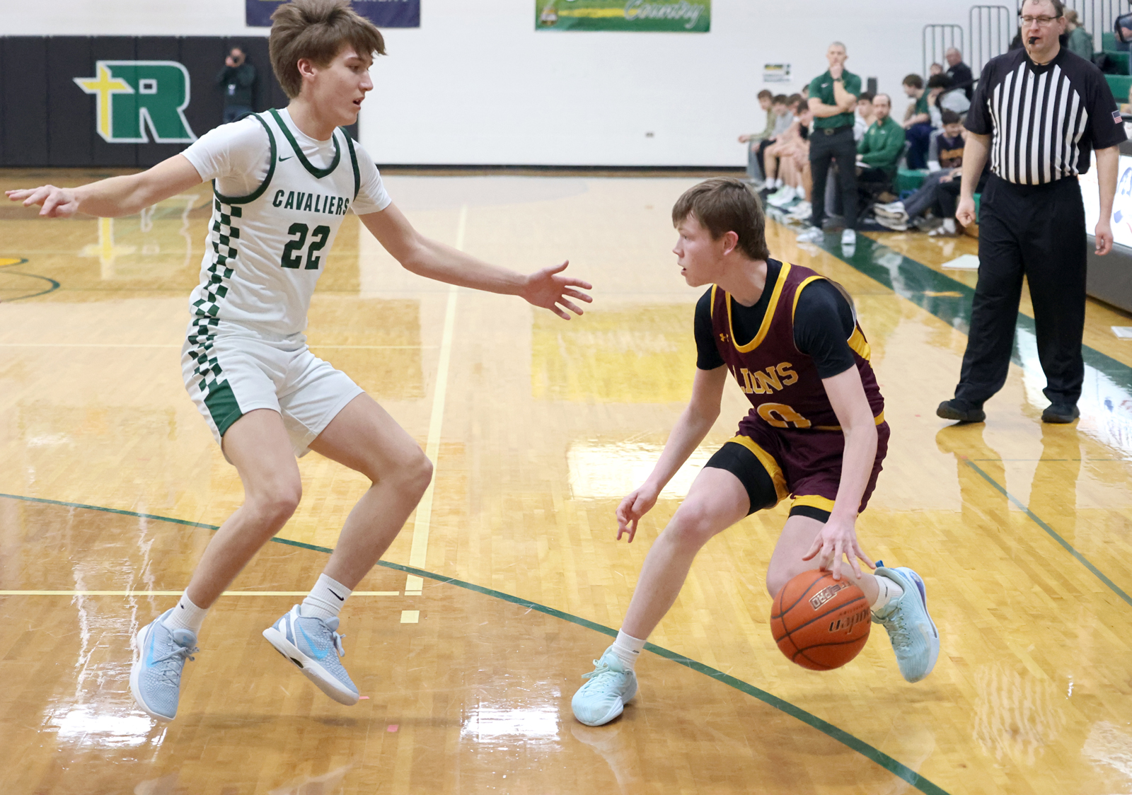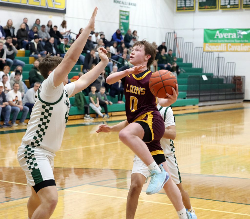 Aberdeen Roncalli’s Bryson Olson, left, defends as Langford Area’s Graydon Hurley, right, moves with the ball during Saturday’s game at the Roncalli High School gym. Photo by John Davis taken 2/21/2026