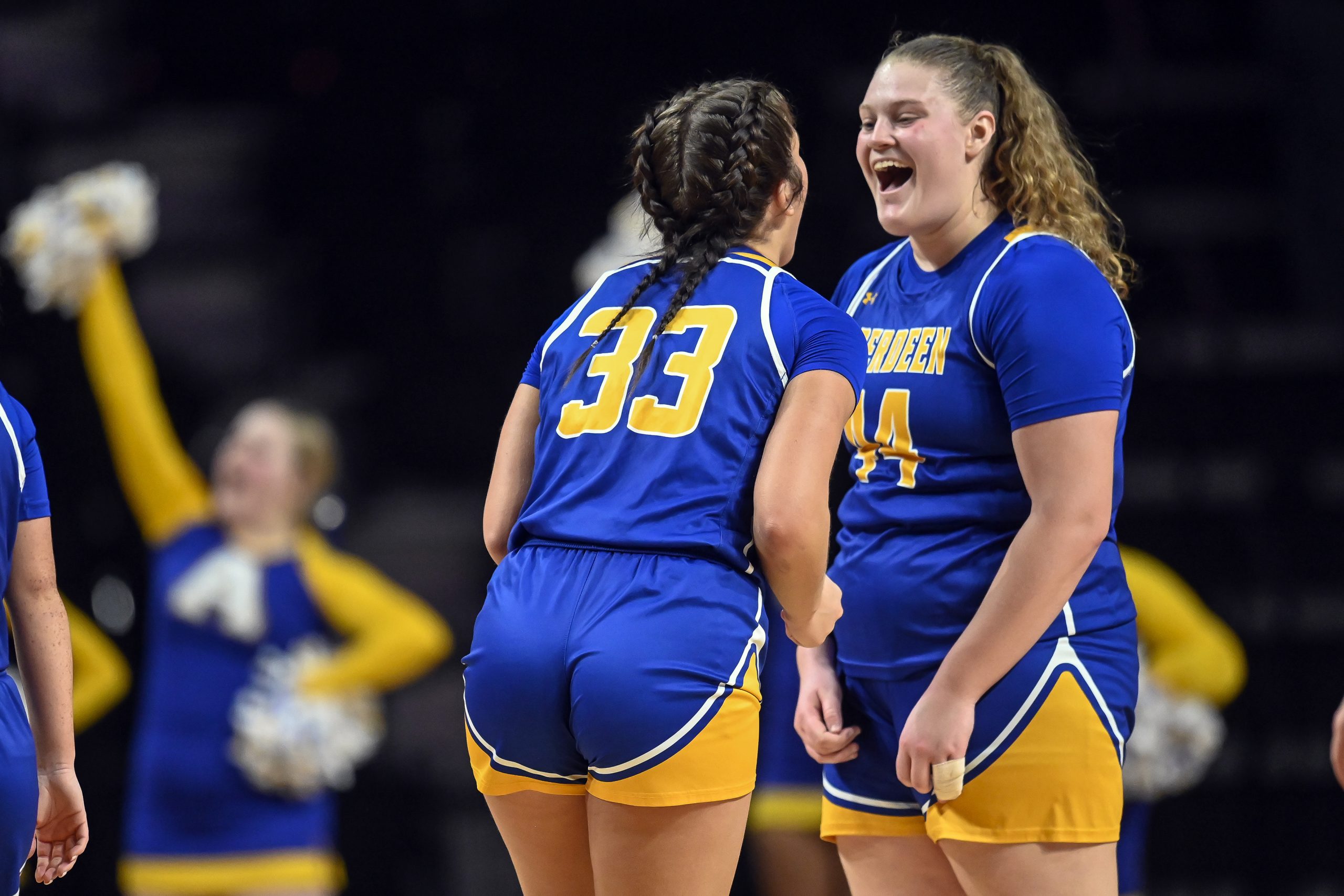 Aberdeen Central's Lauryn Burckhard (33) and Taryn Hermansen celebrate their win over Rapid City Stevens during the first round of the Class AA girls' state tournament on Thursday at Summit Arena at The Monument in Rapid City. ( Matt Gade / 605 Sports)
