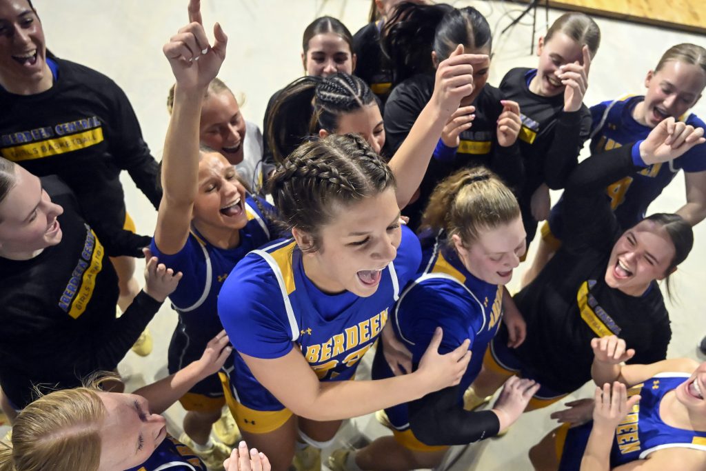 The Aberdeen Central Eagles celebrate advancing to the semifinals after defeating Rapid City Stevens in the first round of the Class AA girls’ state tournament on Thursday at Summit Arena at The Monument in Rapid City. ( Matt Gade / 605 Sports)