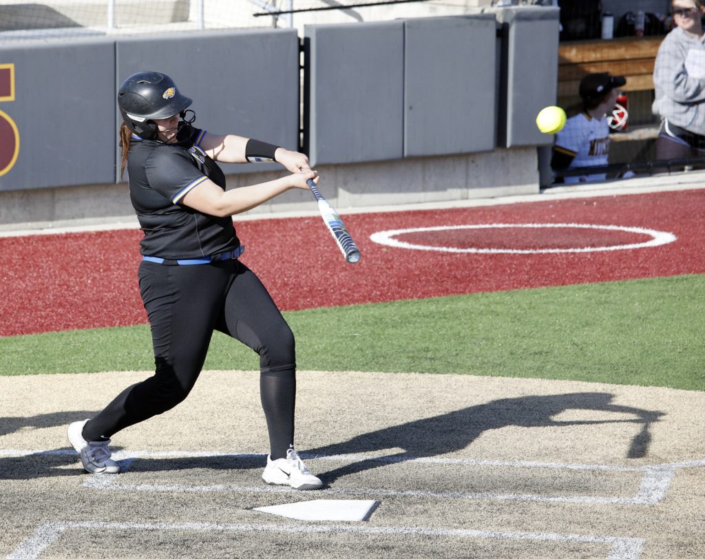 Aberdeen Central’s Jayla Breaw connects with a pitch during a game last season against Mitchell at Koehler Hall of Fame Field. Photo by John Davis taken 4/10/2025