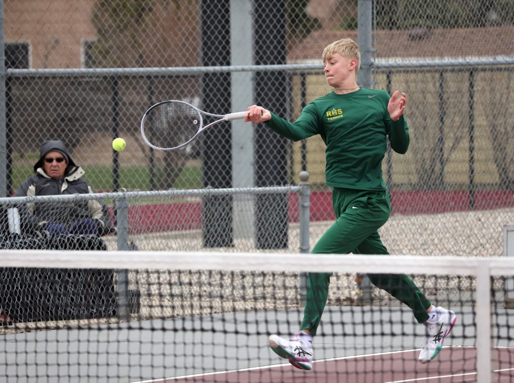 Roncalli’s home-opening matches were played in less than ideal tennis conditions, with cold temps, grey skies and a steady breeze.