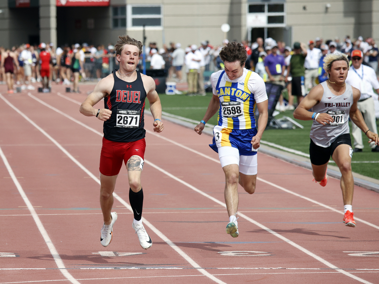 Deuel’s Oliver Fieber, left, reaches the finish line ahead of Canton’s Landon Dominisse, center and Tri-Valley’s Brody Dybvig, right, in the Class A 100 meter dash at last year's South Dakota State Track and Field Meet at Howard Wood Field in Sioux Falls. Fieber has the fastest time in Class A in the 200-meter dash this spring. Photo by John Davis taken 5/31/2025