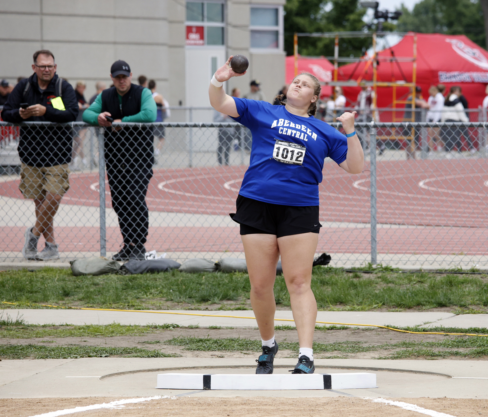 Aberdeen Central’s Taryn Hermansen tosses the shot put lat season at the South Dakota State Track and Field Meet at Howard Wood Field in Sioux Falls. Hermansen recorded the second best throw in state history on Friday in Watertown. Photo by John Davis taken 5/29/2025