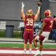 Aberdeen Central’s Karson Borge, left, catches a pass near the goal line for a touchdown as Sturgis’ Seth Burton, right, defends during a game last week at the Brownell Activities Complex. Borge caught a pass for a touchdown and also returned a kickoff for a score in a win over Mitchell Friday night. Photo by John Davis taken 9/26/2025